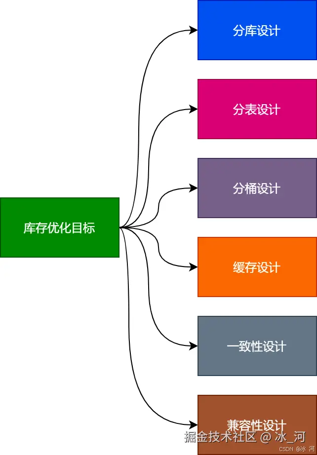 在正式对商品库存进行分库分表和分桶设计之前,我们先来确定下库存优化的目标,也就是分库分表和分桶设计的目标,这样在后续的实现中更有针对性。这里,我主要把库存优化的目标分成了六点:分库设计、分表设计、分桶设计、缓存设计、一致性设计和兼容性设计,如下图所示。