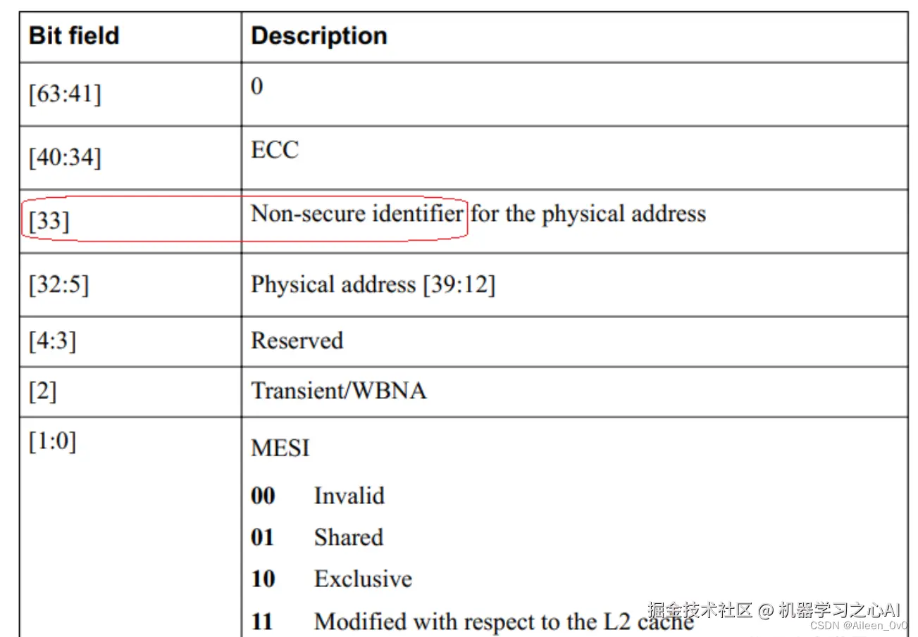 如下所示,以为cortex-A78为例,L1 Data Cache TAG中 ,有一个NS比特位(BIT[33]),表示当前缓存的cacheline是secure的还是non-secure的
