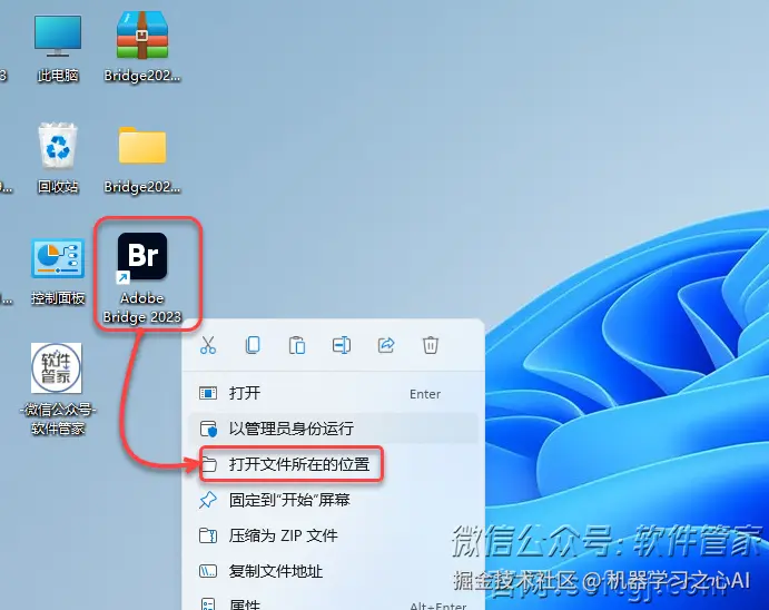 9.鼠标右击桌面【Adobe Bridge 2023】图标选择【打开文件所在的位置】。
