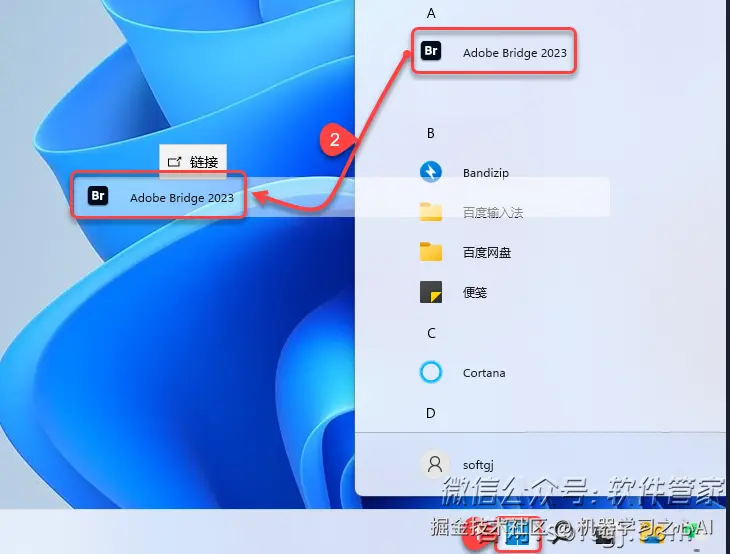 6.创建桌面启动快捷方式:点击任务栏中的【开始图标】,在所有应用中找到【Adobe Bridge 2023】并拖到电脑桌面。
