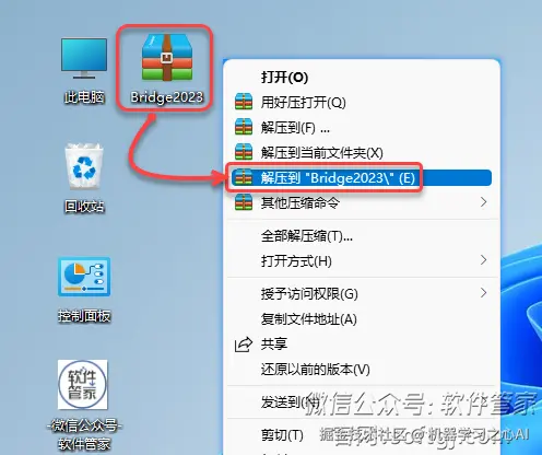 1.鼠标右击【Bridge2023】压缩包选择(win11系统需先点击“显示更多选项”)【解压到 Bridge2023】。