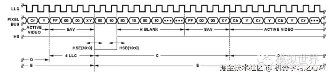 ITU-R BT.601, 16位数据传输;YCbCr (YUV) 信号同时传输,是并行数据,行场同步单独输出。