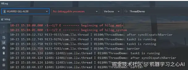 /** * 异步设置屏障任务 */ private void setAsyncDispatchBarrier(Context context) { TaskDispatcher dispatcher = context.createParallelTaskDispatcher("AsyncParallelTaskDispatcher", TaskPriority.DEFAULT); // 创建任务组 Group group = dispatcher.createDispatchGroup(); //将任务1加入任务组 dispatcher.asyncGroupDispatch(group, new Runnable() { @Override public void run() { HiLog.info(label, "task1 is running"); // 1 } }); //将任务2加入任务组 dispatcher.asyncGroupDispatch(group, new Runnable() { @Override public void run() { HiLog.info(label, "task2 is running"); // 2 } }); dispatcher.asyncDispatchBarrier(new Runnable() { @Override public void run() { HiLog.info(label, "barrier"); // 3 } }); HiLog.info(label, "after syncDispatchBarrier"); // 4 }
