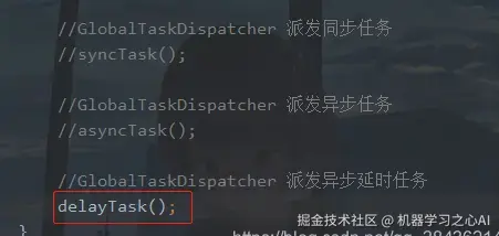 /** * GlobalTaskDispatcher 派发异步延时任务 */ private void delayTask() { globalTaskDispatcher.delayDispatch(new Runnable() { @Override public void run() { HiLog.info(label, "delay task1 run"); final long actualDelayMs = System.currentTimeMillis() - currentTime; HiLog.info(label,"actualDelayTime >= delayTime : " + (actualDelayMs >= delayTime)); } },delayTime); HiLog.info(label, "after delay task1"); }