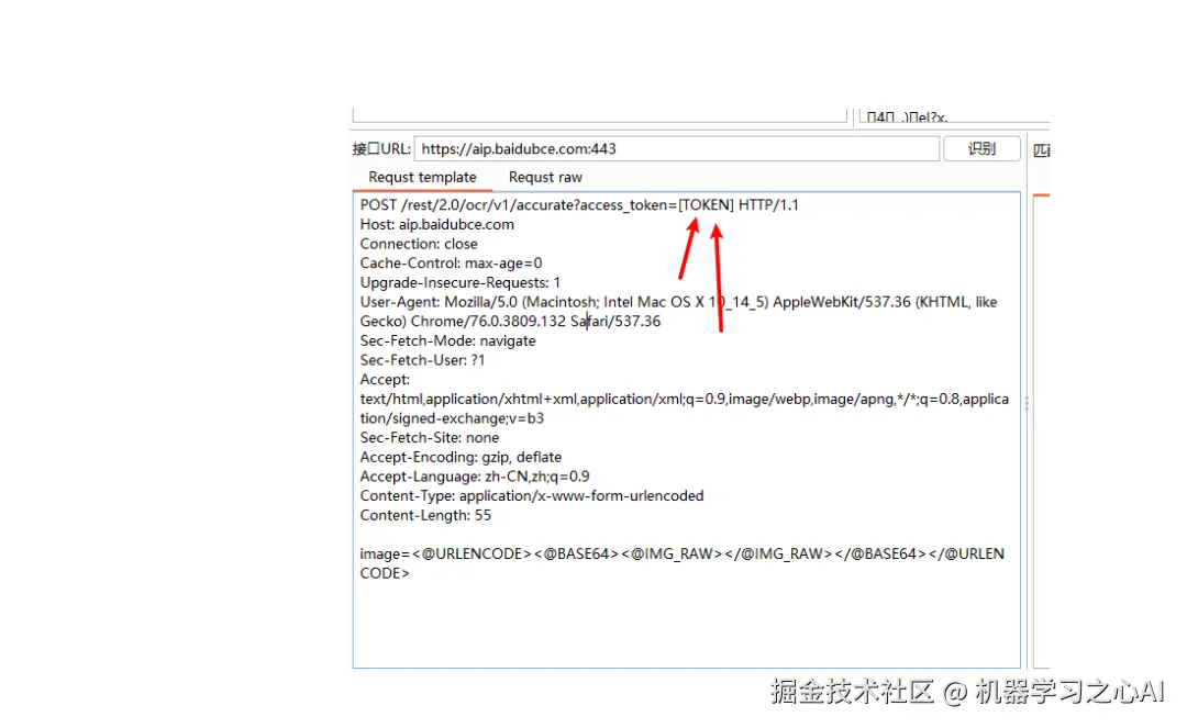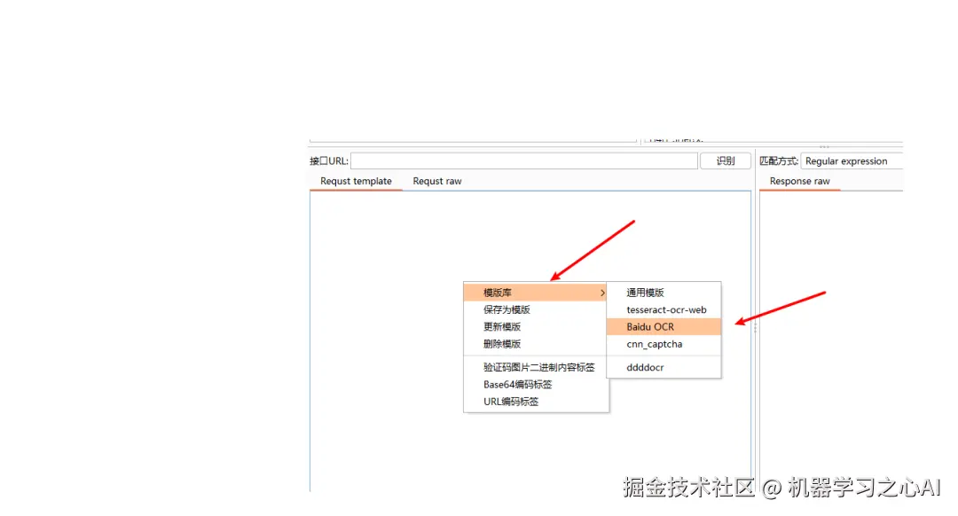6、填写验证码识别接口,这里有百度的可以用,但是有次数限制,需要修改为自己的token,不推荐,但是如果想使用,只需要在接口的大框框里右键--模板库--百度,点击,就会自动填充百度ocr的模板