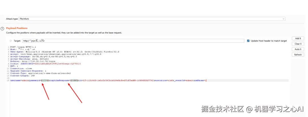 3、添加变量,对要爆破的地方和验证码的地方添加变量,我这里假设爆破密码,所以需要对密码所在的值和验证码的值添加变量