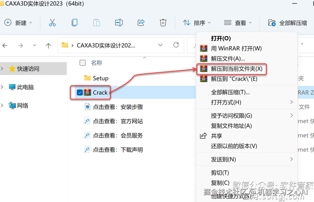 11.打开安装包解压后的【CAXA3D实体设计2023(64bit)】文件夹,鼠标右击【Crack】选择【解压到当前文件夹】。