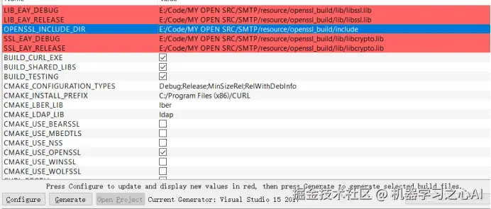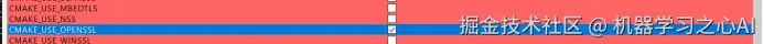 在配置中选择CMAKE_USER_OPENSSL,然后重新点击Configure