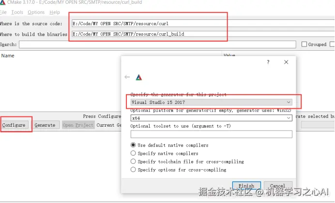 打开cmake-gui,选择好路径,点击configure,选需要生成的版本