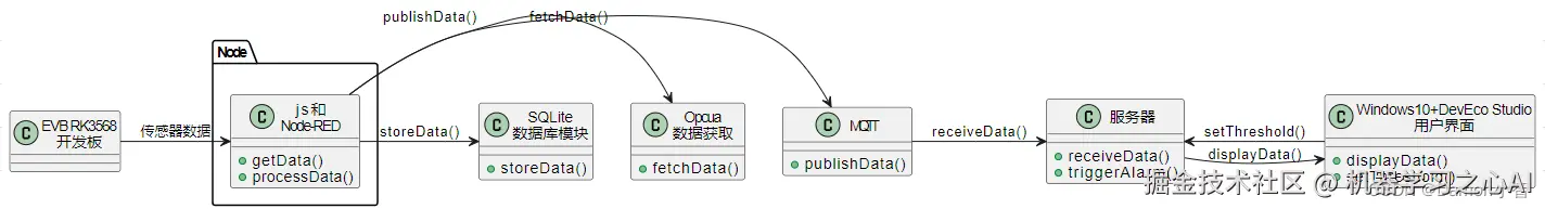 "EVB RK3568\n开发板" -> "Node.js和\nNode-RED": 传感器数据 "Node.js和\nNode-RED" -> "SQLite\n数据库模块": storeData() "Node.js和\nNode-RED" -> "Opcua\n数据获取": fetchData() "Node.js和\nNode-RED" -> "MQTT": publishData() "MQTT" -> "服务器": receiveData()
