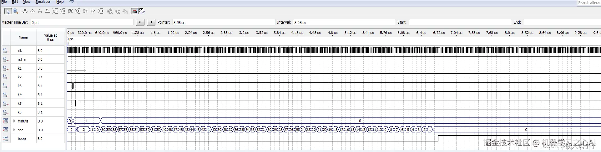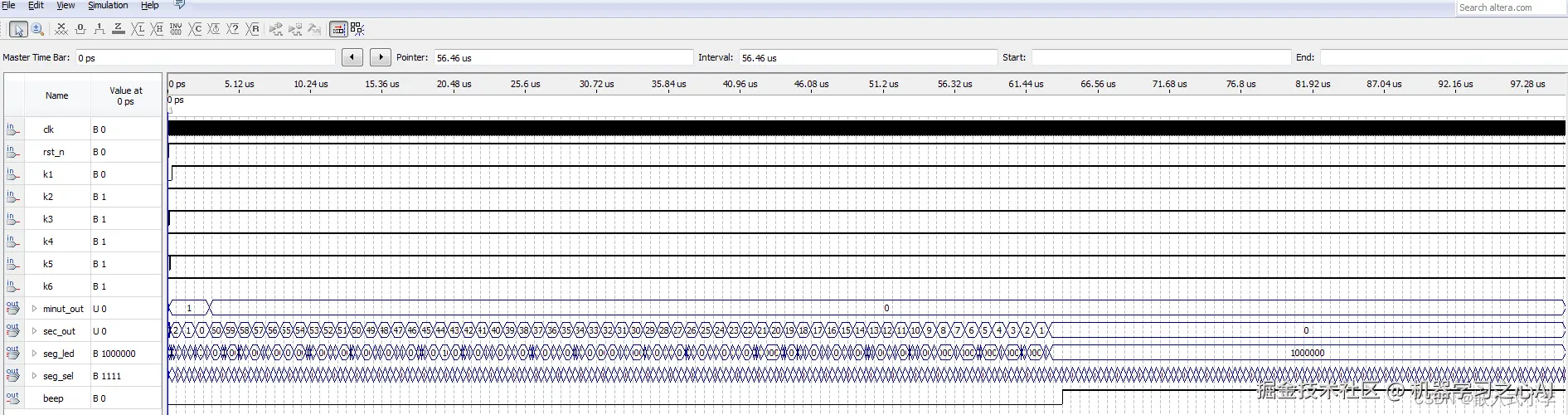 这是不加数码管显示的,为的是更清楚的看到时间的变化。一开始我令k3按下去一个周期 K5按下去2个周期,那么对应的效果就是minute+1,sec+2。从仿真的结果看,确实是这样。随后当k1置为高电平以后,分钟和秒钟在进行倒计时的过程。当时间减完以后,可以看到蜂鸣器输出了高电平,倒计时过程暂停了!