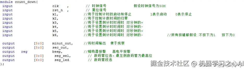 各按键的作用如注释所示,其中minute_out 和 sec_out信号主要是为了在仿真的时候观察输出的时间数值(如果没有这个信号,就需要从数码管的输出段码和位选信号来判断当前倒计时的时间数值,会比较麻烦。用这个信号观察就会比较直观)。