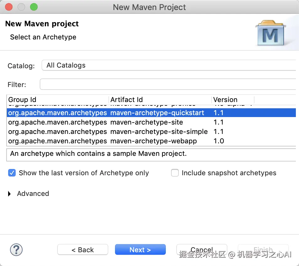 2)在接下来选择项目类型的时候,选择 maven-archetype-quickstart,如下图所示。