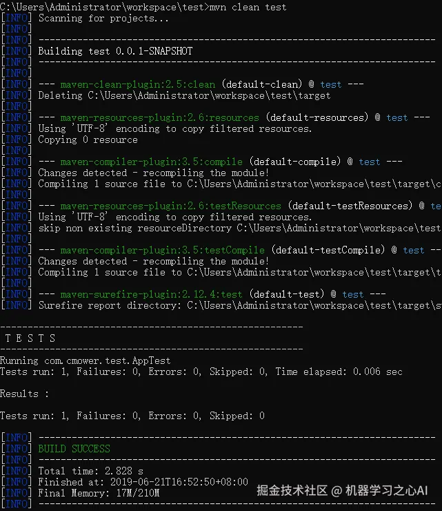 3)测试:mvn test,test 命令在运行时,会执行 compile 命令;而之前我们已经执行过一次 compile 命令,为了确保结果的准确性,可以执行 mvn clean test 命令确保测试之前没有残余物,结果如下图所示。