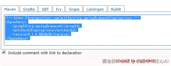 第三步,进入该版本的主页,只需要左键轻轻地在 「Maven」选项卡内点一下,就已经把该类库的 Maven 依赖信息复制到粘贴板了(不需要「Ctrl+C」,非常的人性化),如下图所示。