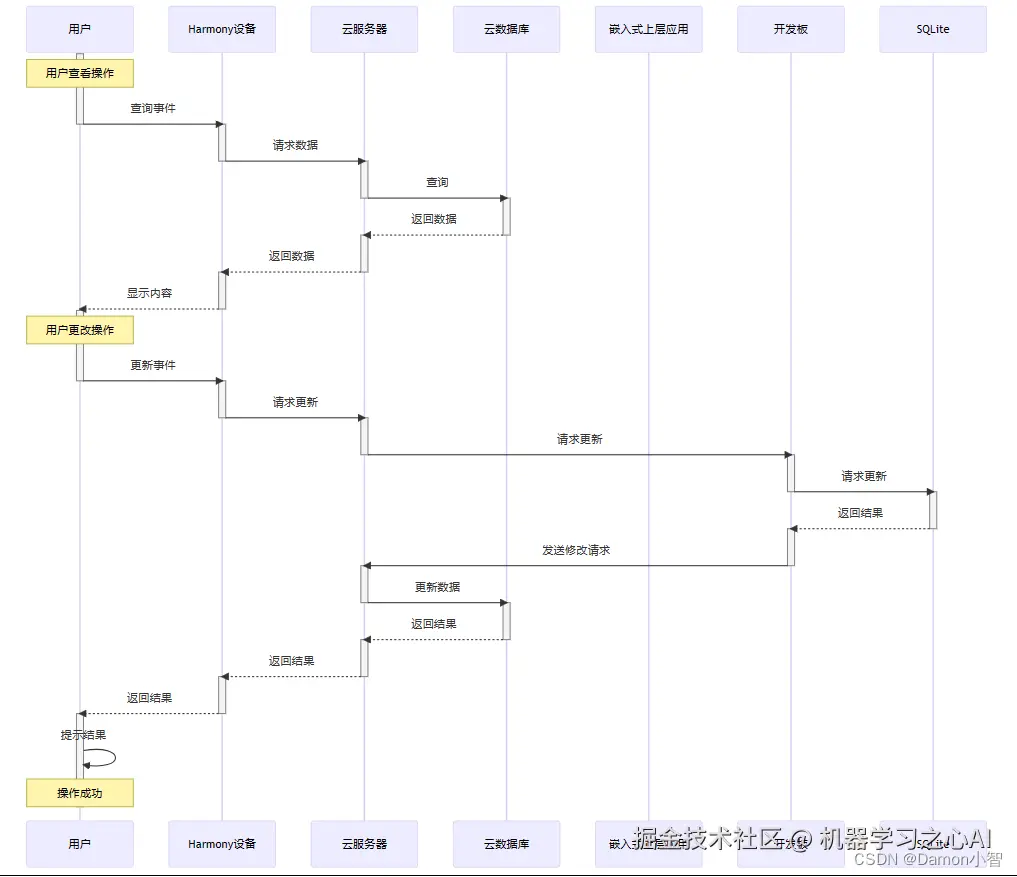 sequenceDiagram participant A as 用户 participant B as Harmony设备 participant C as 云服务器 participant D as 云数据库 participant E as 嵌入式上层应用 participant F as 开发板 participant G as SQLite