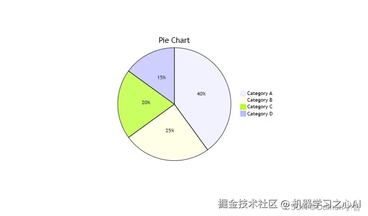 pie title Pie Chart "Category A" : 40 "Category B" : 25 "Category C" : 20 "Category D" : 15