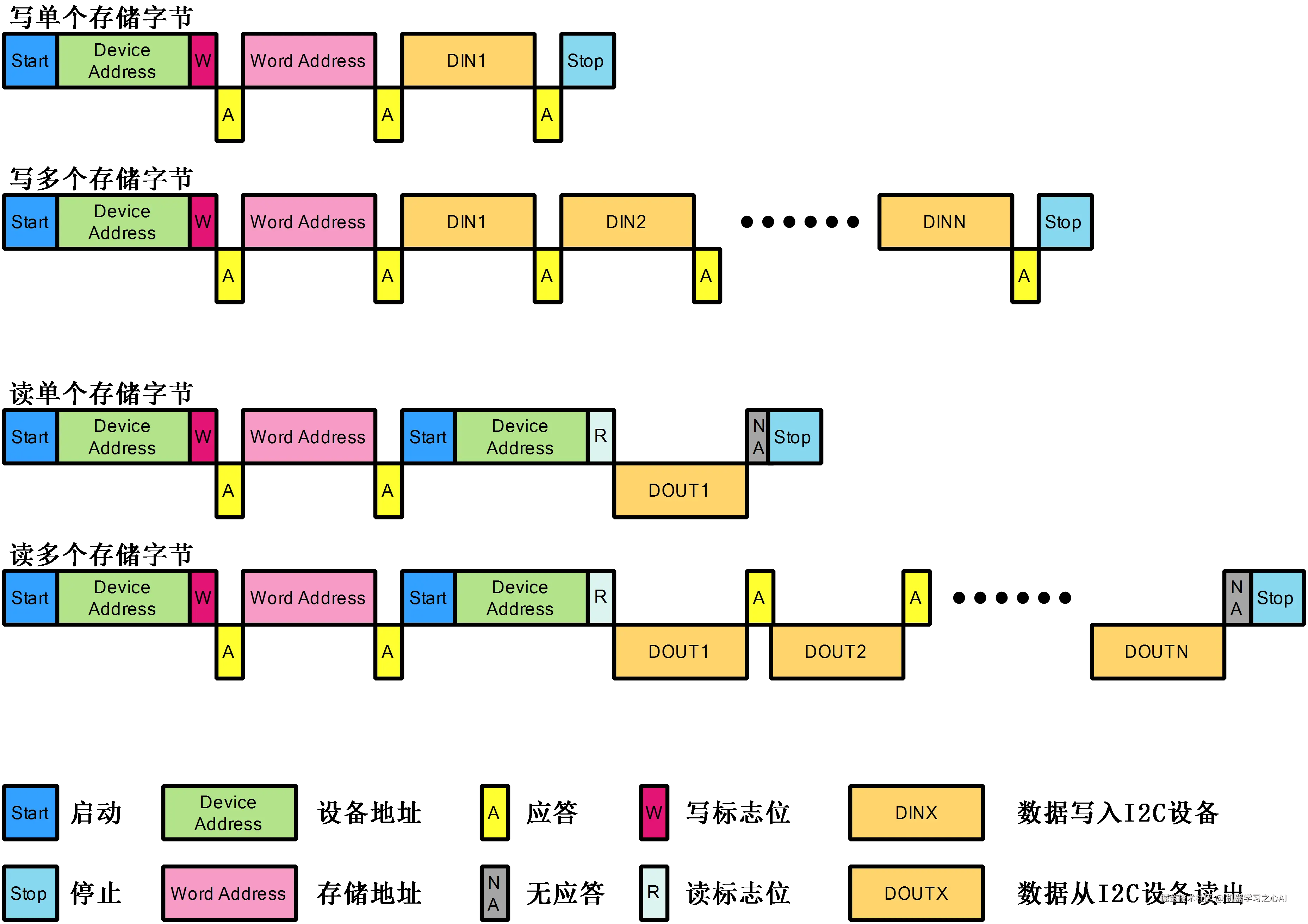 示意图说明:示意图分阐述了4种不同的操作方式,例如写单个存储单元,写多个存储单元,读单个存储单元和写单个存储单元。对于单个操作而言,上部为MCU通过I2C输出的相关指令,下部为I2C设备的响应。例如写单个存储单元操作时,MCU发出I2C启动,设备地址,写标志位等,而I2C设备输出多个ACK。