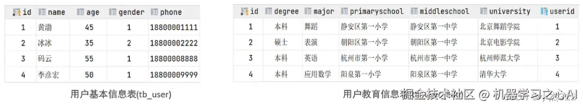 关系:一对一关系,多用于单表拆分,将一张表的基础字段放在一张表中,其他详情字段放在另一张表中,以提升操作效率 (为避免一张表记录过长的情况,字段太多了就可以进行单表拆分,此时拆分的两个表就是一对一的关系)