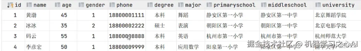 select * from stu; +------+-----------+------+ | id | name | age | +------+-----------+------+ | 1001 | 孙悟空 | 100 | | 1002 | 沙和尚 | 100 | | 1003 | 猪八戒 | 100 | +------+-----------+------+ 3 rows in set (0.00 sec)