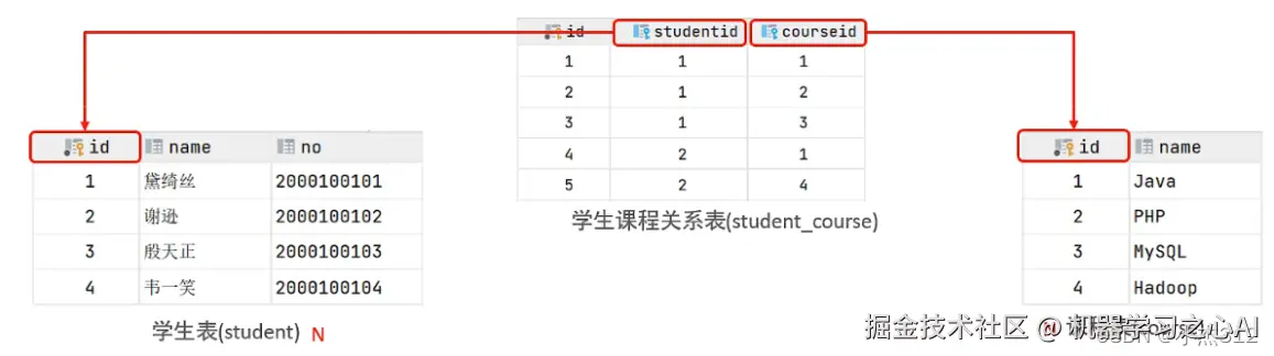 # 准备班级表 create table if not exists class ( `id` tinyint, `name` varchar(10) ) engine = innodb default charset = utf8mb4; insert into class values(1, '重点班'); insert into class values(2, '重点班'); insert into class values(3, '平行班'); insert into class values(4, '平行班'); # 准备学生表 create table if not exists student ( student_id tinyint primary key, name varchar(10), age tinyint, class_id tinyint ) engine = innodb default charset = utf8mb4; insert into student values(10, '张三', 19, 3); insert into student values(11, '李四', 20, 2); insert into student values(12, '王五', 22, 1); insert into student values(13, '赵四', 27, 4); insert into student values(14, '麻子', null, 3);