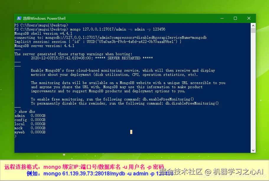 // 该命令会显示MongoDB数据库的相关信息,如果能显示信息,就表示已安装成功了!!!