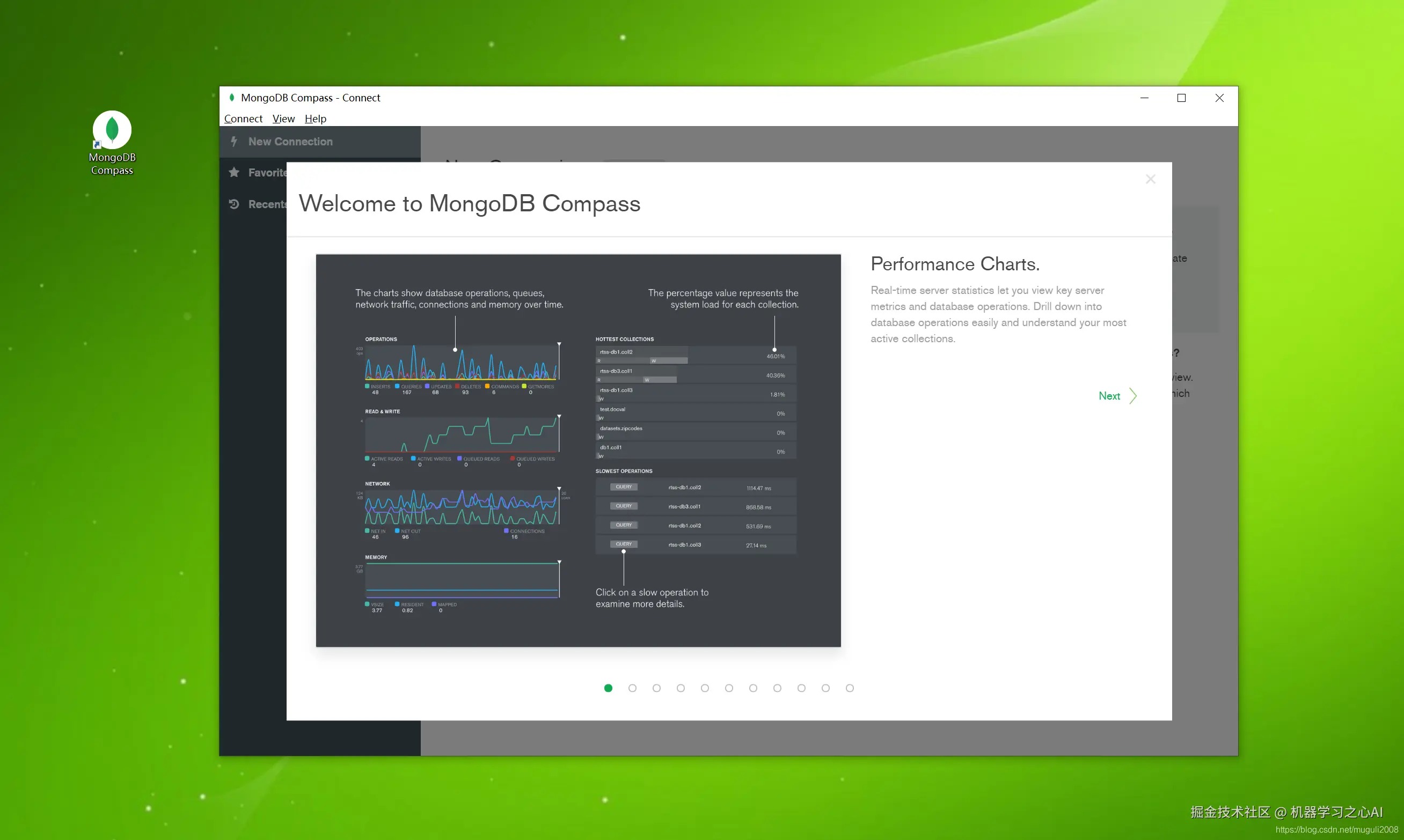 MongoDB Compass的安装没有什么好配置的,直接点击 Next 至到 Flnish 就安装结束啦!
