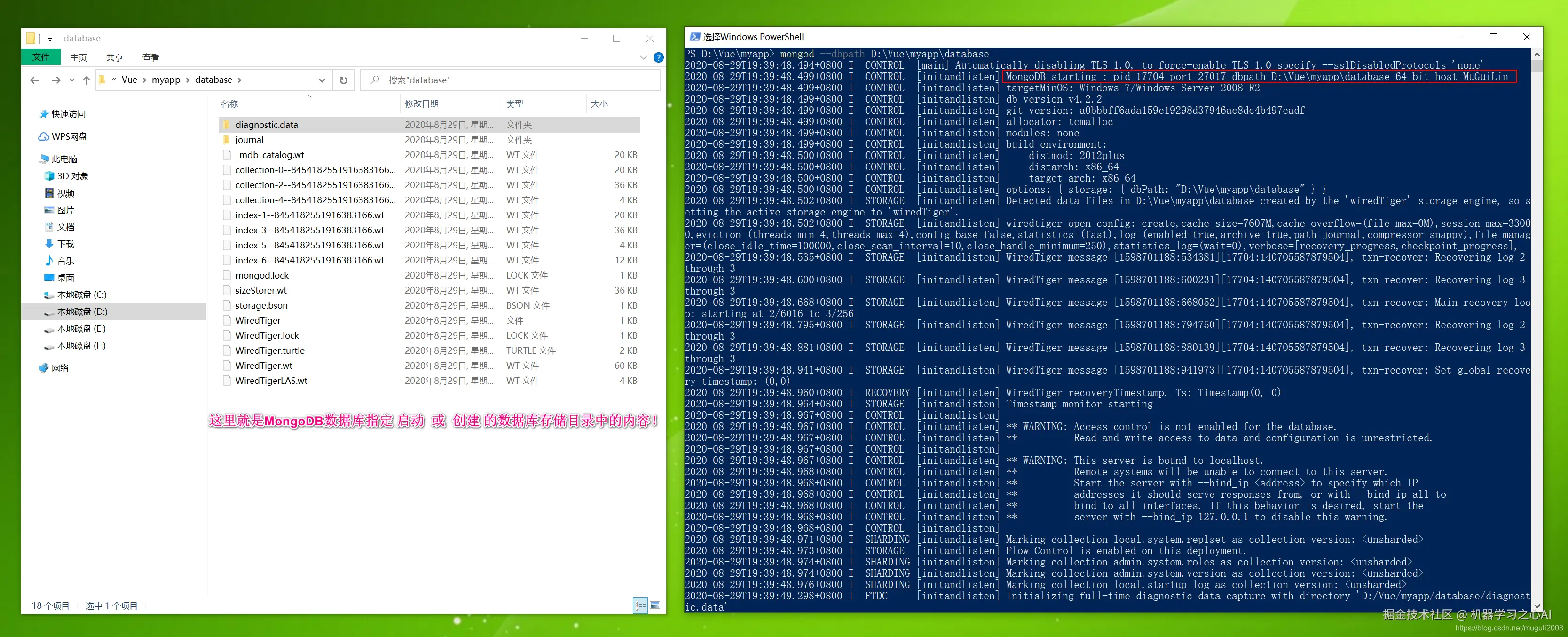 1、在MongoDB中,数据库是以文件形式存储的,数据库目录中存储了相应的数据库!