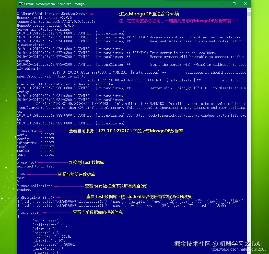 在命令窗口中,输入 mongo 回车, 就进入了MongoDB数据库的语法环境了!