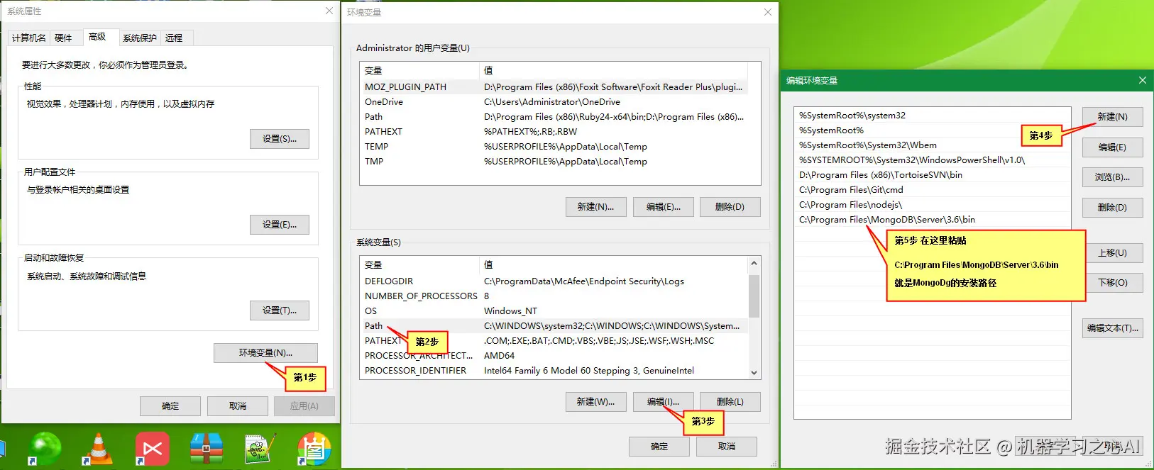 1、配置MongoDB全局环境变量(就是在电脑中任何地方都可以合用mongo、mongod等命令)!