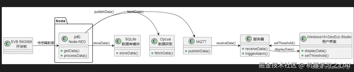 "EVB RK3568\n开发板" -> "Node.js和\nNode-RED": 传感器数据 "Node.js和\nNode-RED" -> "SQLite\n数据库模块": storeData() "Node.js和\nNode-RED" -> "Opcua\n数据获取": fetchData() "Node.js和\nNode-RED" -> "MQTT": publishData() "MQTT" -> "服务器": receiveData()