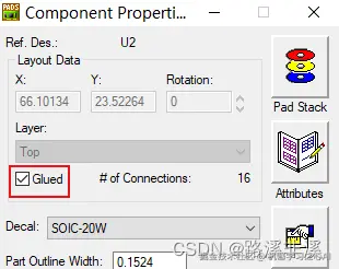 另外要注意下固定glued选项,每个器件双击可弹出属性框,有个glued
