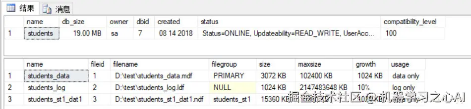 首先向students数据库中添加一个组件students_st1,而后向该文件组中添加两个文件students_st1_dat1和students_st1_dat1
