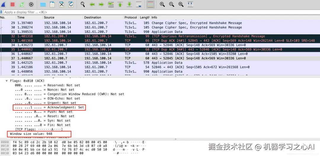 这里使用wireshark抓取baidu.com的TCP报文。可以看到,No.36是本机对服务器之前发送数据(No.31)的一个ACK确认(ACK的Flag标记成1),同时声明窗口大小(window size)为1040。