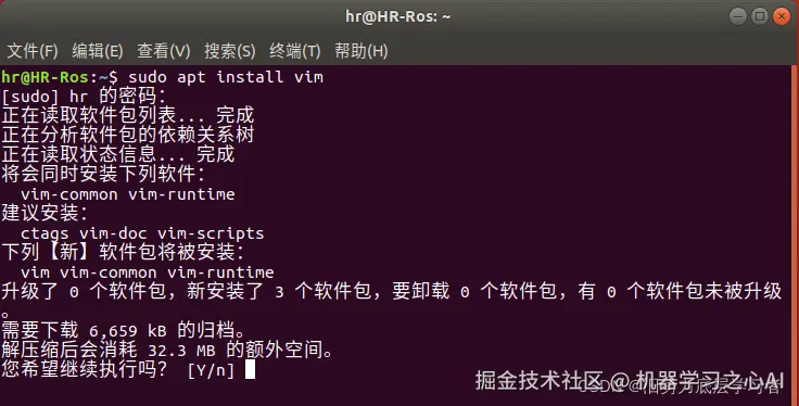 4-再次输入sudo apt install vim即可安装,输入Y同意,等待安装完成即可。