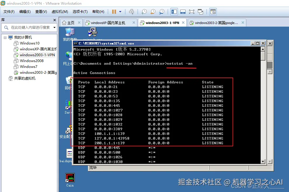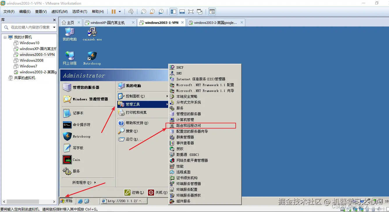 **1)**使用一台windowsXP、两台windows2003或2007/8虚拟机,一台当做VPN服务器,windowsXP网络设置为VMnet1,VPN服务器一块网卡设置成VMnet1另一块网卡设置成VMnet2,某国google服务器网络设置为VMnet2
