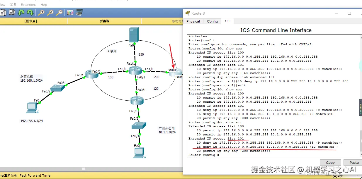 acc 101 permit ip any any # 将所有的ip地址都加入101号地址池内,全部允许通过(除了92.168开头网段访问172.16开头网段的包)