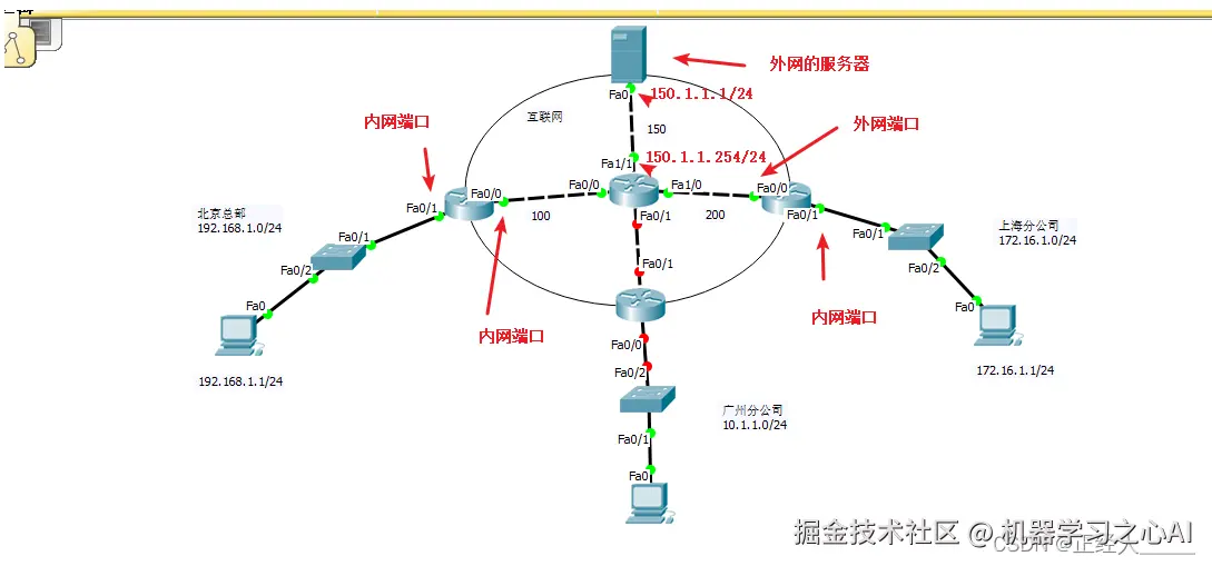 ip nat inside source list 100 int fa0/0 overload # 源ip地址如果在地址池1中,就允许使用f0/1接口上的公网ip地址做替换,然后再做端口转换