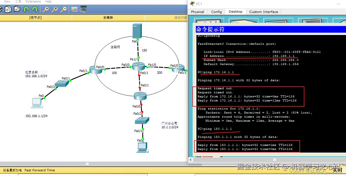 4)拿一台PC继续ping一下目标公司的PC,测试网络的连通性