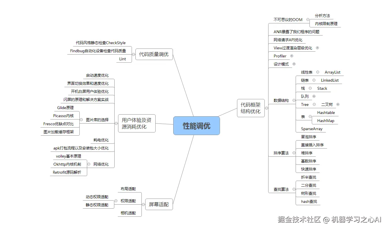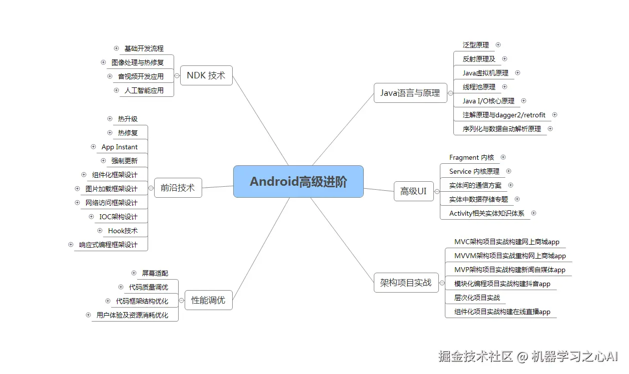 我搜集整理过这几年阿里,以及腾讯,字节跳动,华为,小米等公司的面试题,把面试的要求和技术点梳理成一份大而全的“ Android架构师”面试 Xmind(实际上比预期多花了不少精力),包含知识脉络 + 分支细节。