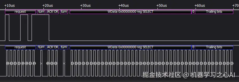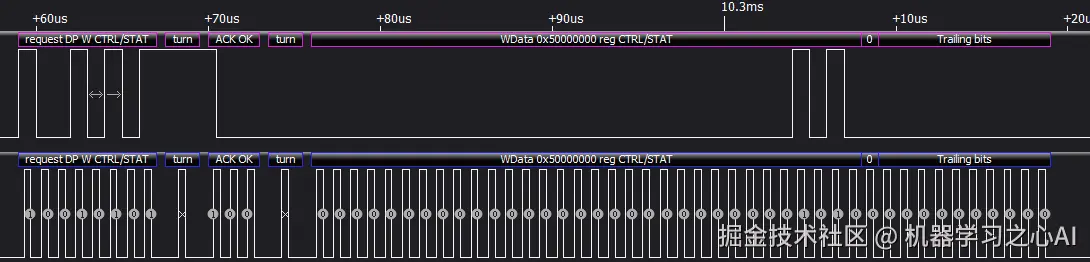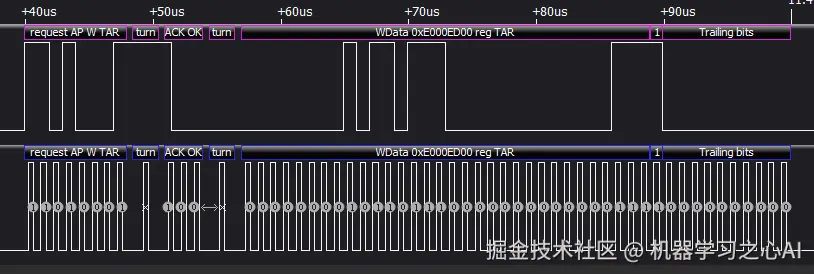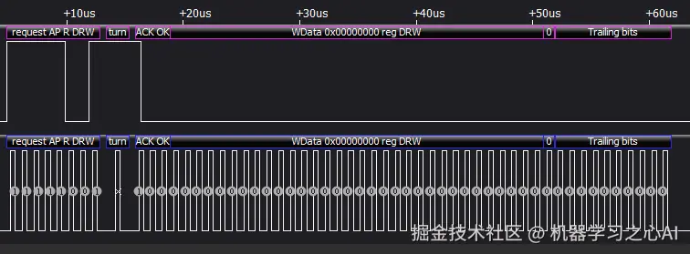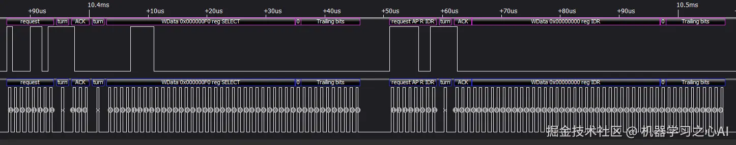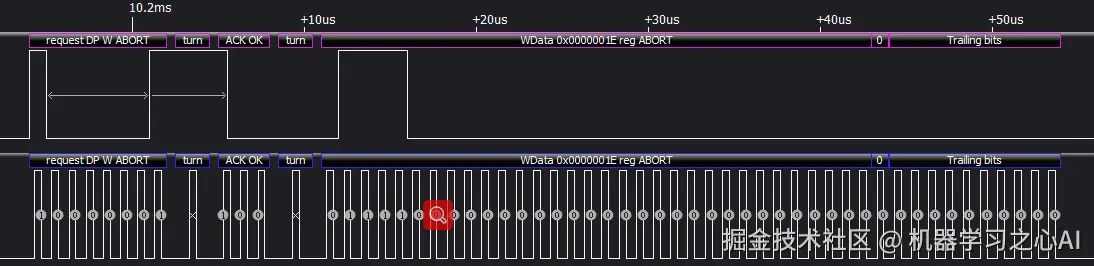 - 第五步通过AP命令包头的ADDR[3:2]地址,确定APBANK内部的地址为0x0C(DRW),发送读AP命令。此时读回来的数据为正确数据。(这里读DP的RDBUFF也可以,详细请自行查阅寄存器文档)
