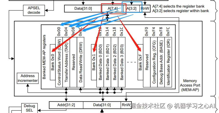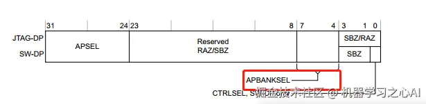 如图,AP寄存器,APBANK决定的是BANK 0x0 -> BANK 0xF.ADDR[3:2]决定的是BANK内部的地址(ADDR[1:0]都是0),0x00,0x04,0x08,0x0C,