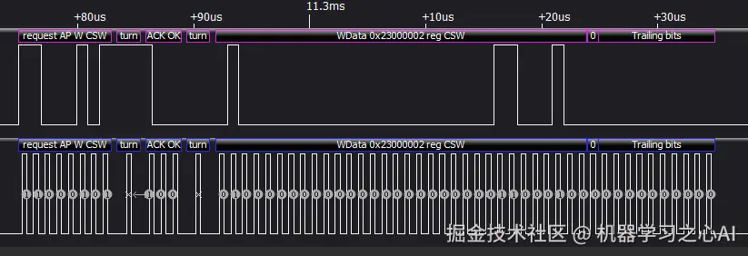- 第二步通过AP命令包头的ADDR[3:2]地址,确定APBANK内部的地址为0x00(CSW),发送写AP命令。数据为0x23000012(该值可能有问题,此处请自行查看CSW寄存器描述,如果这个值写完之后依然不能写入DRW,请联系我).