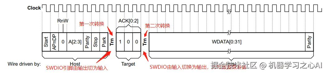 - Trn: 调转周期,在该周期中,不对线进行前驱动,实际应用时,这个时候要将SWDIO引脚的输入输出状态翻转。这个周期的时间由TURNROUND控制(位于WCR寄存器中)。