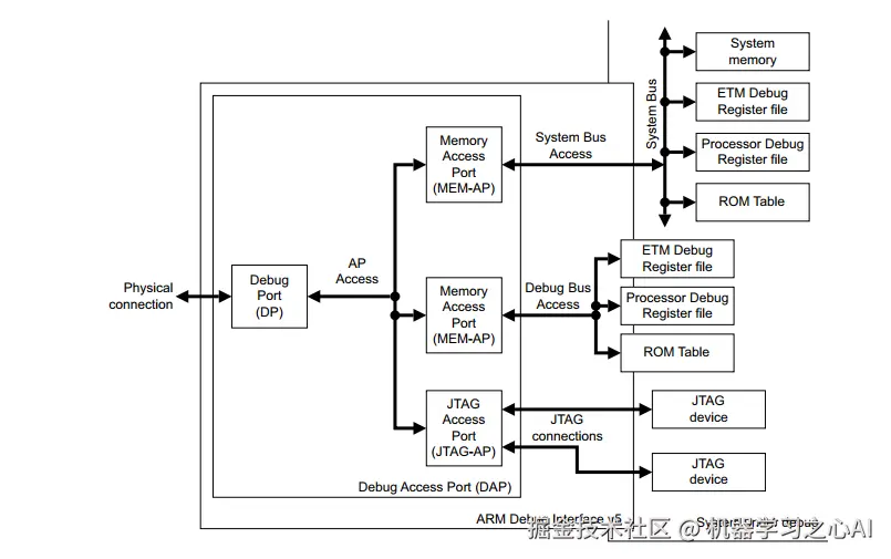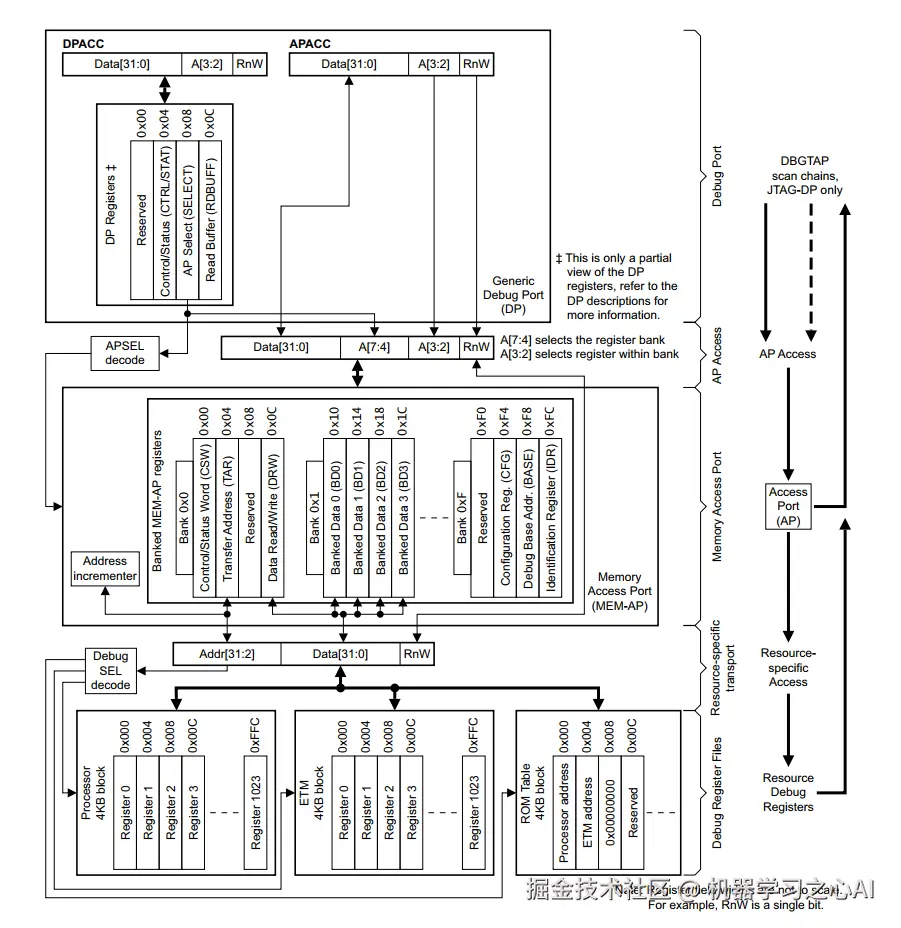 如图所示,DP就是Debug port,AP 就是 Access port。如果要访问内核寄存器,就得先配置DP->AP->MEM-AP。