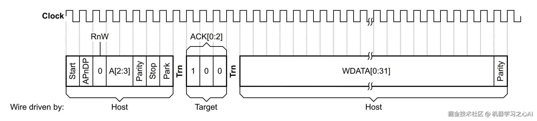 - 第三步通过AP命令包头的ADDR[3:2]地址,确定APBANK内部的地址为0x04(TAR),发送写AP命令。数据为要读取的寄存器地址。