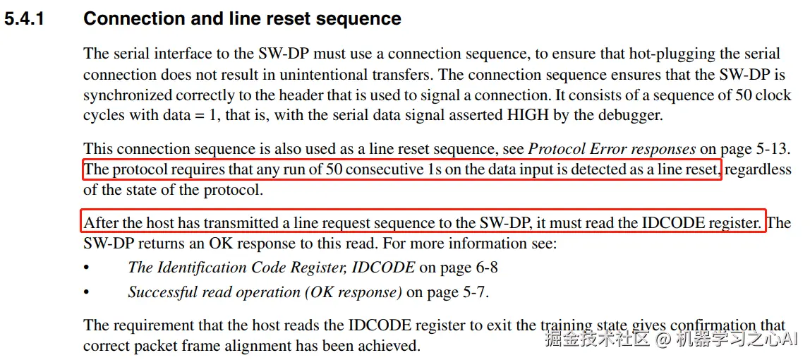 如下图,ARM对SWD的复位有明确的说明,要求连续50个时钟周期的高电平,认为是SWD复位,同时复位之后必须读一次IDCODE(位于DP寄存器中)。