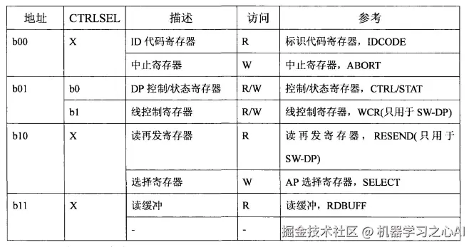 DP寄存器如下图,地址就是我们在包头中的ADDR[2:3],这两位指示的地址。具体的寄存器实在是太多了,具体的请参考《ARM Debug Interface v5 Architecture Specification》。